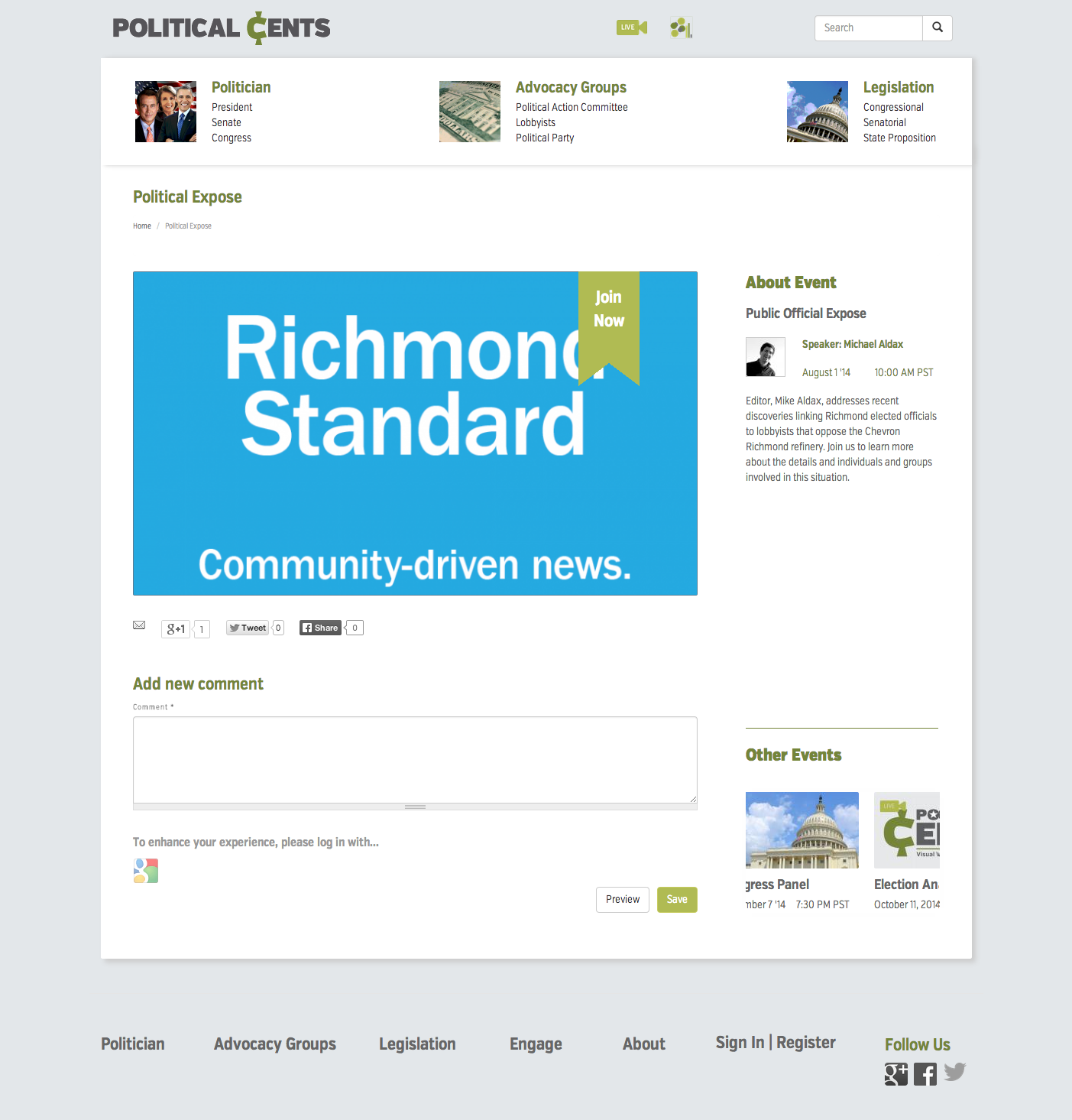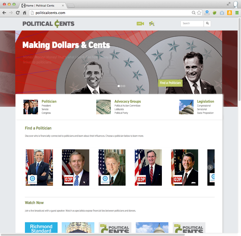 Political Cents is a responsive website prototype that visualizes campaign finance data through interactive and engaging online tools.
